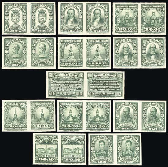 Scott #'s 220-231 Unlisted plate proofs on card in dark green. All with XF margins. 12 different horizontal pairs. XF condition. ABNC. Scarce trial colors.