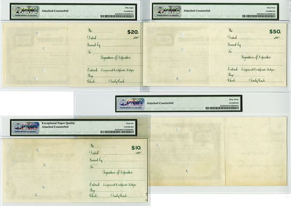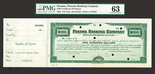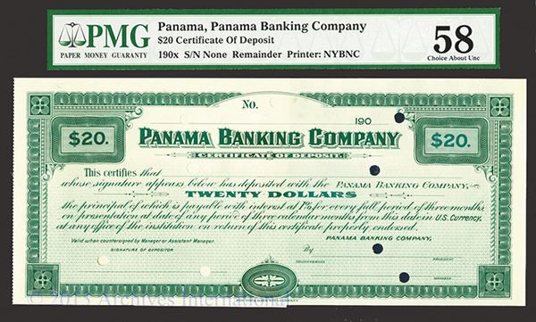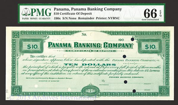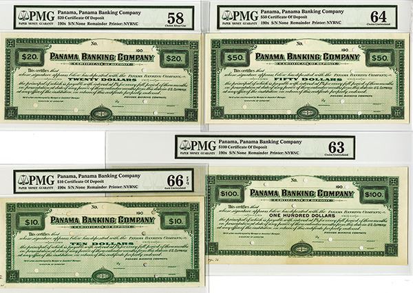 Panama, lot of 4 Specimen circulating "CD's", Includes $10; $20; $50 and $1000 denominations, all are printed in green with counterfoil at left, All with title in middle top all were taken from a New York Bank Note Company sample book and were the only examples found, all are 8 1/2 inches x 3.75 inches, All have counterfoil at left and the $10 and $100 having archival notations on the lower left corner of the note margin with the date "Apr (19)'08" and initials "J.R.", Payable in U.S. dollars, all with POC's in signature blocks, they are PMG graded, the $10, Gem Uncirculated 66 EPQ; $20, Choice About Uncirculated 58; $50, Choice Uncirculated 64; and $100, Choice Uncirculated 64. The Certificate was negotiable at any office of the company and would pay 1% interest every 3 months (4%) per year. Once endorsed, it could be cashed by anyone or used as currency. The Panama Banking company was founded in 1868 in Panama and New York by the firm ñMerchants Bankers, Messrs. Isaac Brandon & Brothersî. It was one of the strongest financial institutions in the Republic of Panama. The officers were Isaac Brandon, President and founder, New York; Nathaniel Brandon, Vice President, New York; V. I. Brandon, Treasurer, New York; and P. G. Eastwick, General Manager, Panama. The building of the Panama Canal (1903 to 1914), overseen by President Theodore Roosevelt and achieving the realization of a long term U.S. goal of a trans- isthmian canal, only enhanced the business of the Panama Banking company. The Panama Banking Company had branches in the cities of Panama and Colon at both entrances of the Panama Canal (Balboa and Cristobal, Canal Zone) to do a general banking business and were fully equipped for the transaction of all financial business in the Republic of Panama and the Canal Zone. It also had special facilities for the payment of tolls and disbursements for vessels using the Panama Canal.