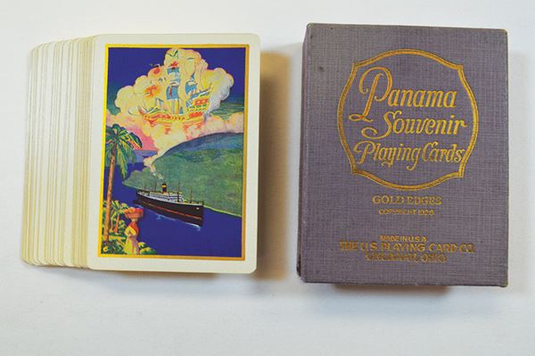 Panama Canal and Railroad and steamship interest. 1926. Card depict discovery ship in clouds and modern steamship in canal. Includes Joker, two 1926 Auction Bridge tables of points, and map card. In blue holder and slipcase, which is now lightly faded.