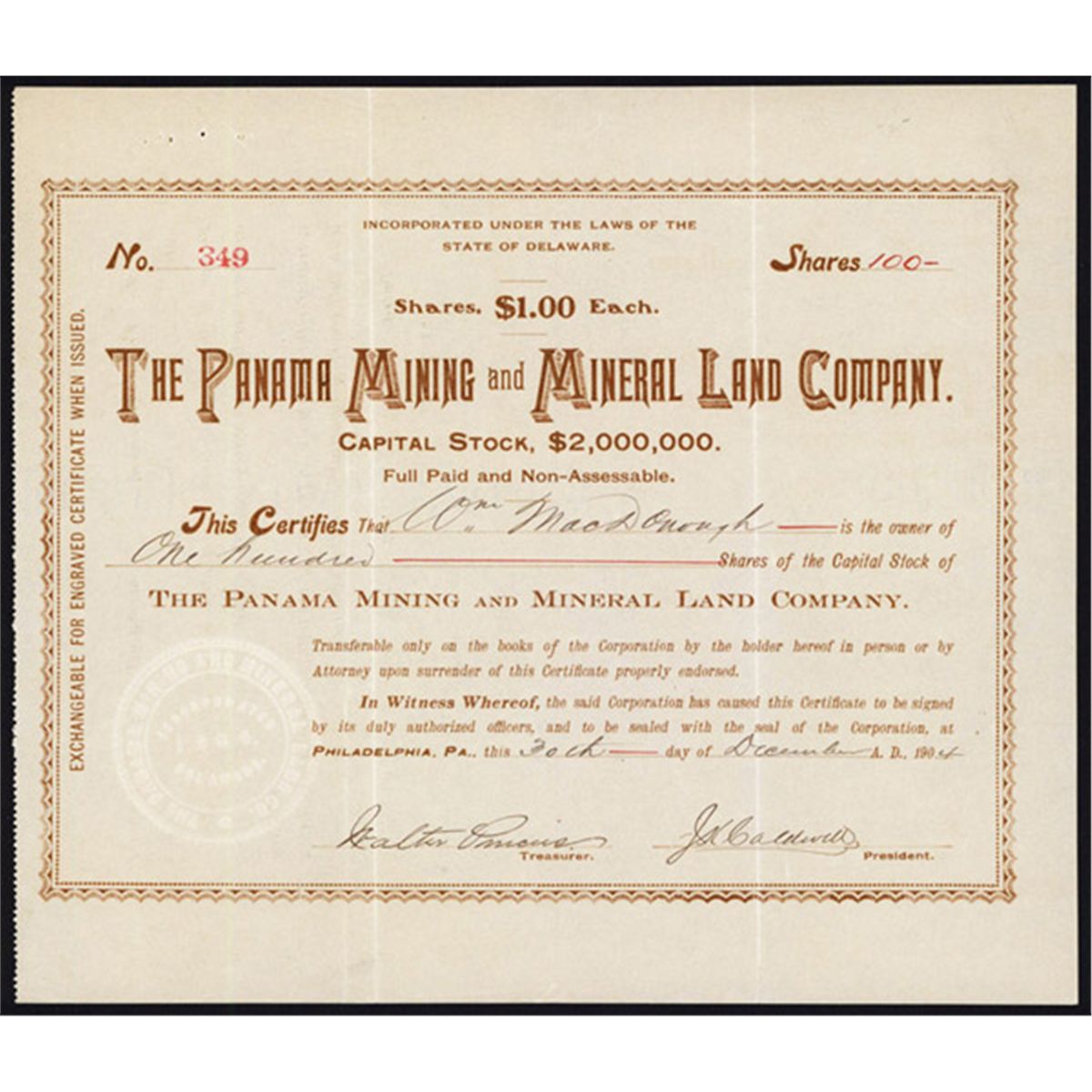 Panama (Incorporated in Philadelphia), 1904, 100 Shares, Issued and uncancelled, brown with no vignette, XF condition. Scarce Panama related stock.