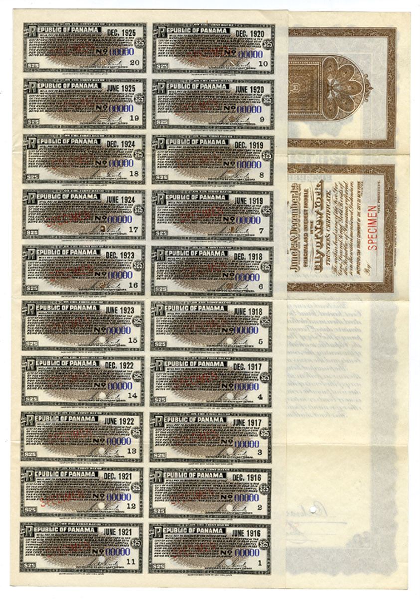 Panama, 1915. $1000 Specimen 5 % Secured Serial Gold Coupon Bond, Black print with brown border and underprint, Allegorical man and woman pouring oil into lantern at top, Specimen overprints and POCs, XF-AU condition, ABNC.