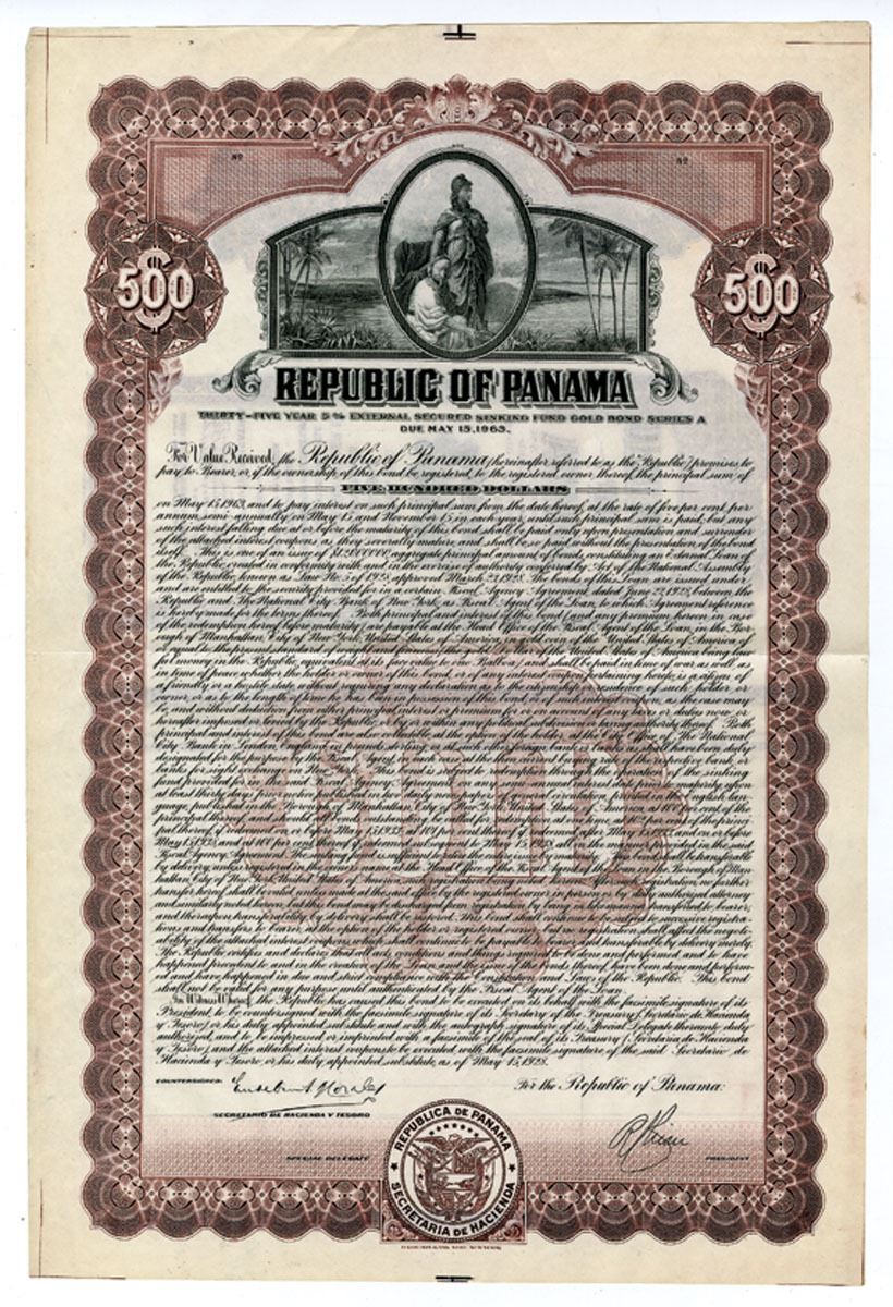 Panama, 1928. $500 Specimen (Uncancelled and Possibly a remainder), 5% Thirty Five Year External Secured Sinking Fund Gold Bond, Black print with maroon border and underprint, Figures at top with beaches of Panama behind them, XF condition, HBNC.