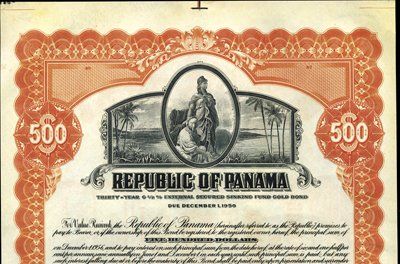 1926. $500. Specimen 6-1/2% External Gold Bond. No cancellation. Orange border. Standing allegorical woman with palm trees and ocean in background. Choice uncirculated. Rare specimen. HBNC.