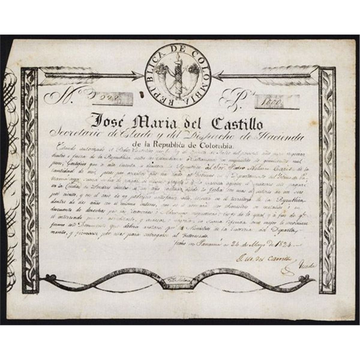 Panama, Republica De Colombia, 24th May, 1824, 1000 Pesos, P-Unlisted, S/N 222, Issued and uncancelled, Black on thick watermarked paper, Left and right borders with leaves inside rectangular boxes Colombia Arms on top with what appears to be a bow with string on bottom, text partially printed and partially handwritten, back with numerous endorsements and signatures,