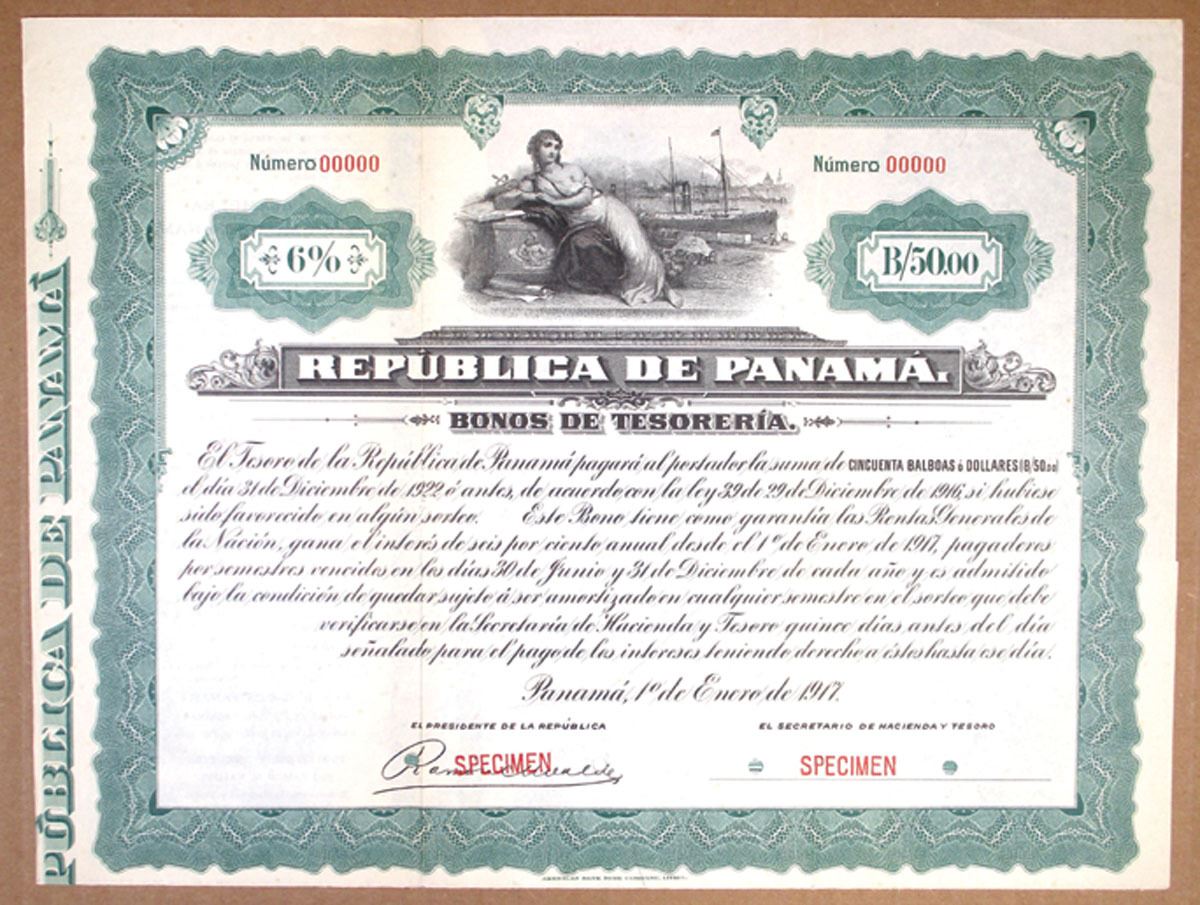 Panama, January 1, 1917, 50 Balboas, 6% Bond, Specimen, Coupons attached, green border with allegorical reclining woman with steamship behind her at dock, XF condition, "00000" serial numbers and POC's. Rare Panama bond. ABNC.