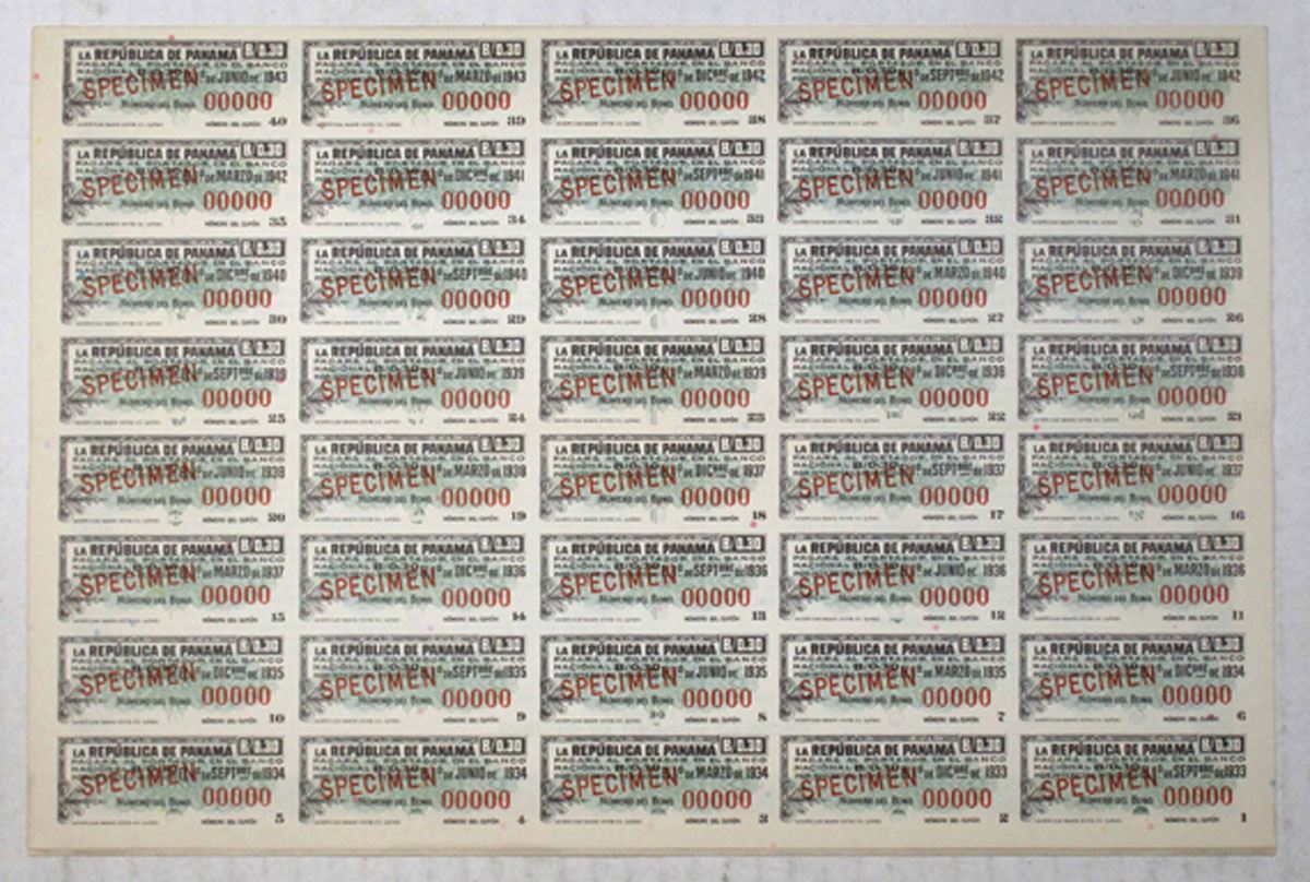 Panama, 1st June, 1933, 20 Balboas, Specimen bond, 6% Bonos De Conversion 1933-43, coupons attached, Black on green border and underprint, Allegorical angels flank eagle on top of shield with Initials R De P. Specimen overprints, POC's, Last Specimen on top right margin, XF condition. ABNC.