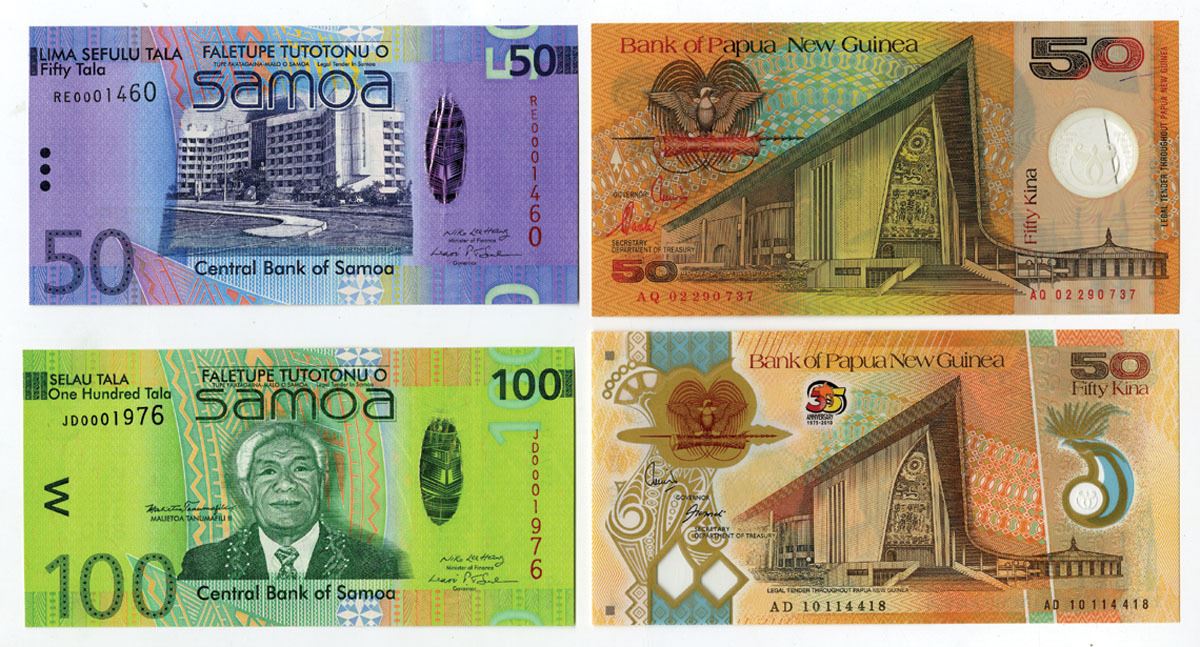 Papua New Guinea & Samoa, 2002-10. Lot of 4 Issued Banknotes, Includes: Bank of Papua New Guinea, 50 Kina, P-18b, 2002; 50 Kina, P-42, 2010; Central Bank of Samoa, 50 Tala, P-41a, 2008; and, 100 Tala, P-43a, 2008. Notes are AU to Unc condition. (4). Sold "AS IS" no returns accepted.