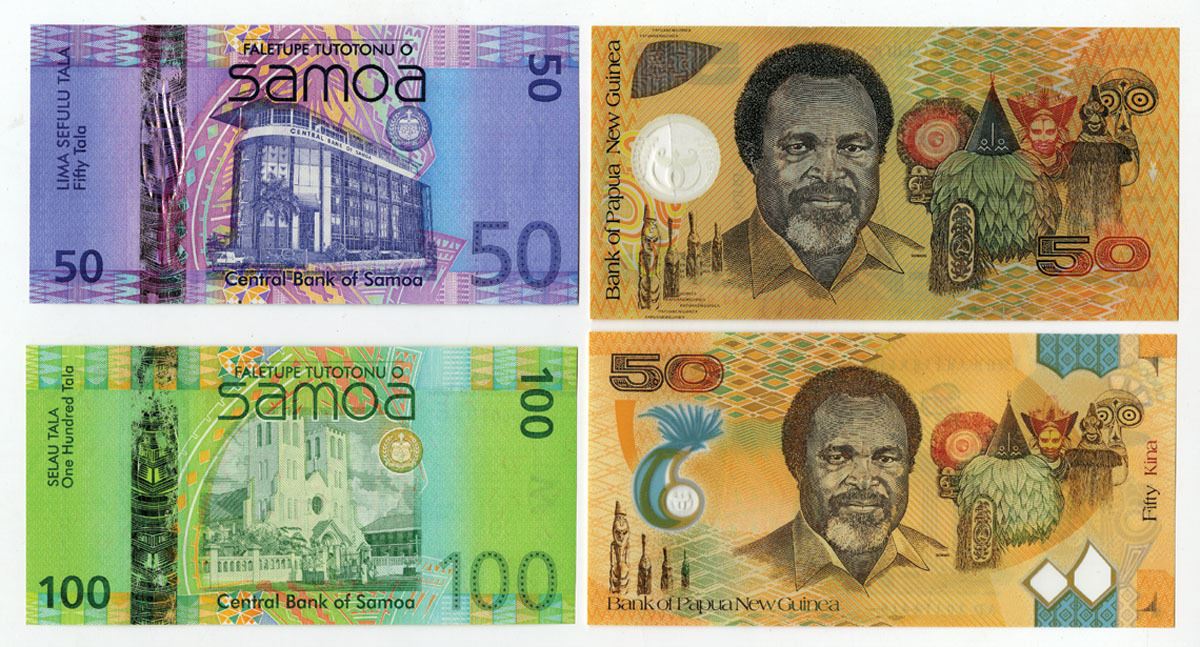 Papua New Guinea & Samoa, 2002-10. Lot of 4 Issued Banknotes, Includes: Bank of Papua New Guinea, 50 Kina, P-18b, 2002; 50 Kina, P-42, 2010; Central Bank of Samoa, 50 Tala, P-41a, 2008; and, 100 Tala, P-43a, 2008. Notes are AU to Unc condition. (4). Sold "AS IS" no returns accepted.