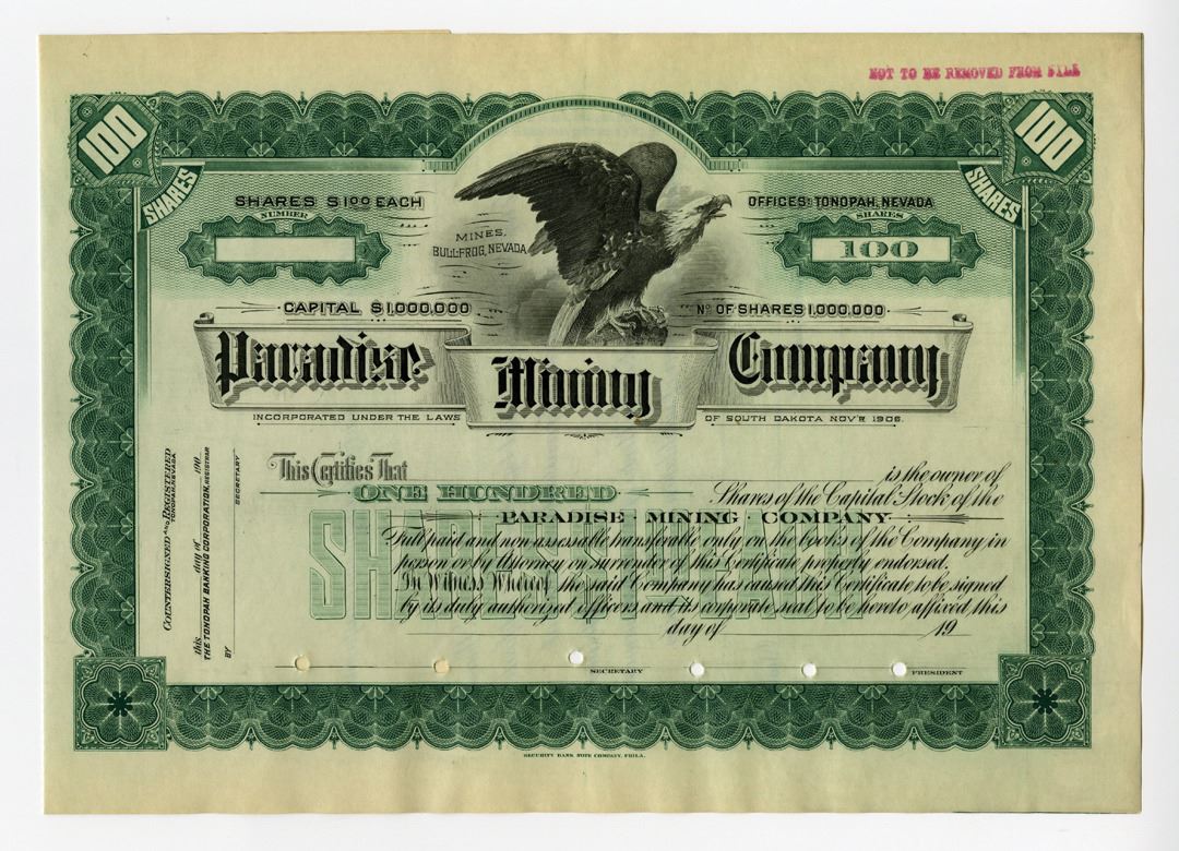 Bullfrog Mining District, Nevada, (Inc. in South Dakota), ND (ca.1900). 100 Shares Capital Stock Specimen Certificate, Black on green border and underprint with Bald Eagle at top, POCs, VF-XF condition, SBNC.