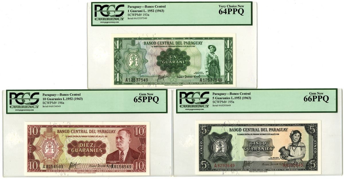 Paraguay, L.1952 (1963). Lot of 3 Issued Banknotes, Includes: 1 Guarani, P-193a, S/N A12537549, PCGS graded Very Choice New 64PPQ; 5 Guaranies, P-195a, S/N A8293649, PCGS graded Gem New 66PPQ; 10 Guaranies, P-196a, S/N A8154549, PCGS graded Gem New 65PPQ. Notes are printed by TDLR. (3). Sold "AS IS" no returns accepted.