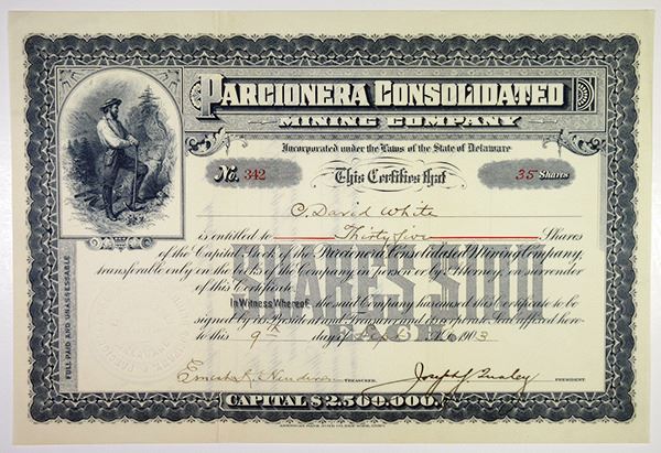Santa Eulalia, (Inc. in Delaware), 1903, 35 Shares I/U Capital Stock Certificate, Black text with navy blue border and undertint. Allegorical figure of a miner at rest to the left, XF condition, ABNC NY.