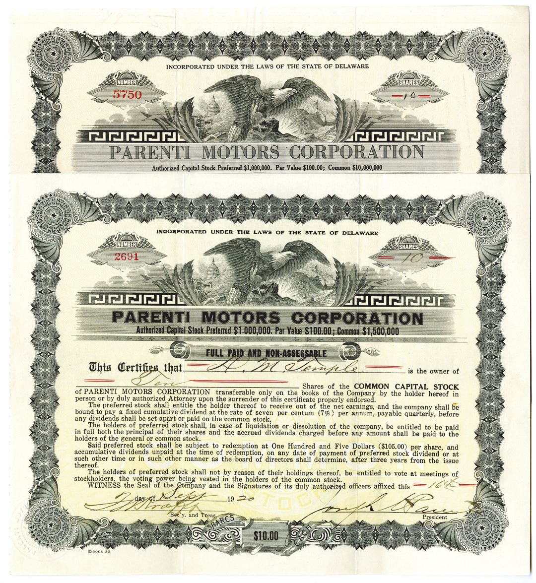 Delaware. 2 pieces: 1920 10 Shares I/U 7% Capital Stock Certificate; 1921 10 Shares I/U 7% Capital Stock Certificate. Both have black text with black border, yellow underprint, and an eagle at top center. Fine condition with some signs of splitting along vertical fold lines. (2)