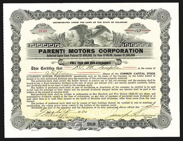 Buffalo, New York, 15 shares, I/U, Signed by Parenti as president, the company could not sell enough to stay in business. Rare stock certificate from this short lived automobile. XF.