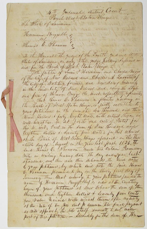 Parish of West Baton Rouge, Louisiana, 1839. 8 pages, handwritten document from the 4th Judicial District Court of the Parish of West Baton Rouge, bound with pink ribbon. Entire document is the regarding of the court case of Herman Briggs & Co. vs Thomas Shannon. Shannon was accused of owing over $6,000 to Briggs & Co. This legal document outlines the resulting payment schedule to be completed by Briggs, and includes several signatures and dates throughout the process. Dates mentioned within are from 1836 to 1839. Fine condition, especially considering its age, with fragile fold lines. Unique and fascinating legal document complete with judicial terms and conditions.
