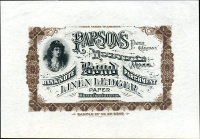 Holyoke, MA. ca.1880-90's. International BNC printed advertising sheet for paper manufacturer. Text states "Sample of No.29 Bond, Banknote, Parchment, ?.". Ornate stock or bond border with allegorical woman on upper left and ornate title and text. Intaglio printed. Choice condition. Rare paper sample sheet. IBNC.
