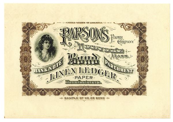 Holyoke, Massachusetts, International BNC printed advertising sheet for paper manufacturer. Text states "Sample of No.29 Bond, Banknote, Parchment, É.". Ornate brown stock or bond border with allegorical woman on upper left and ornate title and text printed in black. Intaglio printed. Uniface, Choice Uncirculated condition. Rare paper sample sheet. IBNC.