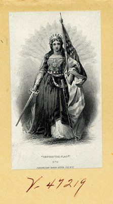 ca.1859-1880's. 18 different Allegorical patriotic women proof vignettes. Most of these images were used on obsolete banknotes, stocks, bonds, checks and security printed documents. The vignettes range from 2 to 3 inches in size. Titles include "Defending the Flag"; "America"; "Union"; "Justice and Loyalty"; "Constitution"; "Columbia"; "Return of Peace"; "Liberty"; "Constitution" (a different version) with the balance untitled. All are printed on india paper and mounted to large archival manila envelopes. Printers include ABNC; NBNC; RWHE; CBNC; TCCC and the others unattributed. Columbia has an additional proof vignette underneath it if you are interested in soaking it. All are in Fine to choice uncirculated condition. Please inspect. Extremely attractive and diverse group of Patriotic strong female allegorical vignettes, most of well known images.