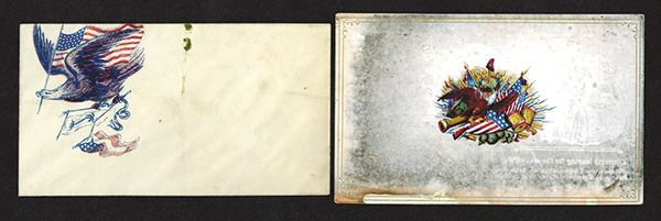 Bold Eagle with US Flag, holding South Carolina and CSA flag on broken staffs in talons. Eagle on shield with trophy of arms on coated card stock. 2 pieces.