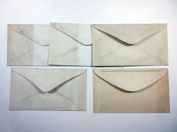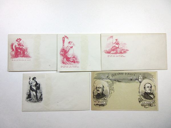 Lot of 5 patriotic envelopes, all unused and in VF condition. Includes allegorical figures with patriotic statements and one full envelope design, "Our Army & Navy" with Butler and Stringham portraits, Attractive group.