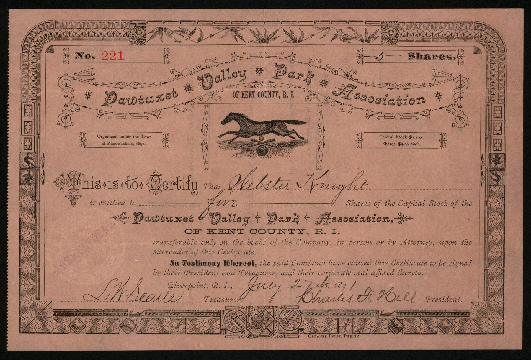 Kent, Rhode Island, 1891. 5 Shares I/U Capital Stock Certificate. Black printing on pink paper with small image of horse, baseball and baseball bat and ball at center of certificate. VF-XF condition.