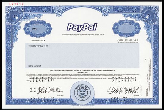 Delaware, 2001, Pin-Punch Specimen Stock, Black on blue border and underprint, Company logo top center, VF-XF condition, SCBNC. Early IPO era for this company pre-eBay.