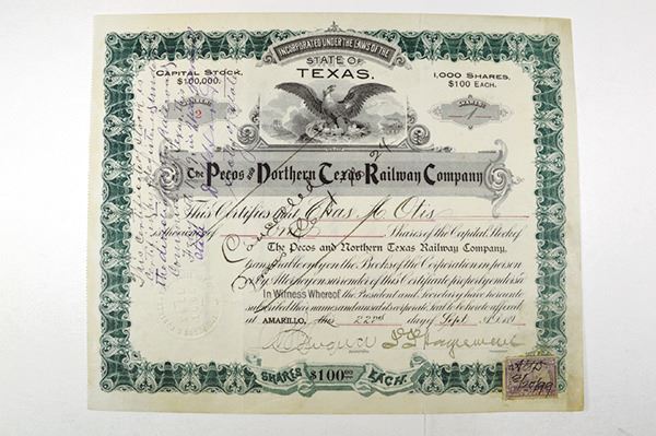 Texas. 1 Shrs Stock Certificate (#2). Issued & Cancelled transferred to #24. VF, light edge tone.