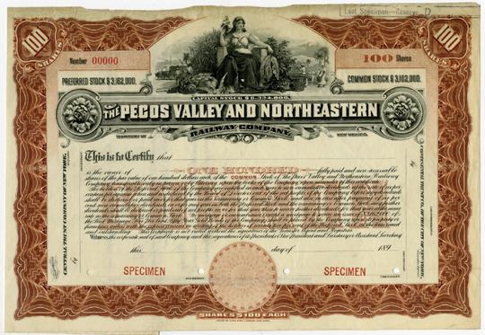 New Mexico Territory, ND (1890s). 100 Shares Specimen Stock Certificate, Black text with brown border and underprint, Allegorical woman with plants at top center. Red specimen overprints, 00000 serial number, and POC. Fine condition with staining and signs of wear, especially at top margin. ABNC.