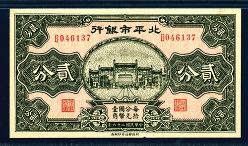 China, 1937. 2 Cents, P-S2501a (S/M#P27), Issued banknote, gateway at center, Back black, PMG graded Choice Uncirculated 64 but appears Gem, exceptional note in extremely high grade that will enhance the most advanced China collection. Only 3 graded of this issue, none higher.