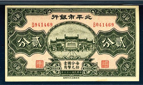 China, 1937. 2 Cents, P-S2501a (S/M#P27), Issued banknote, gateway at center, Back black, PMG graded Choice Uncirculated 64 but appears Gem, exceptional note in extremely high grade that will enhance the most advanced China collection. Only 3 graded of this issue, this is the second offered in the auction of equal grade as the previous example that will be impossible to improve upon.