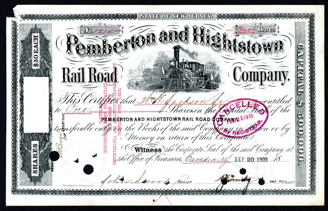 New Jersey, 1909, Pemberton & Hightstown Co. 1 Share, $50 each, Stock Certificate, Stock Certificate. VF with a small UL corner tip missing.