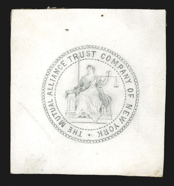 Mutual Alliance Trust Company of New York. Justice seated at center. 47mm design on 74mm square card.