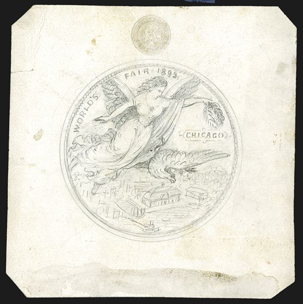 World's Columbian Exposition, Chicago, 1893. Pencil sketch for medal. Victory and eagle above view of exposition buildings. 102mm design on Laubenheimer impressed card stock 160mm square. No. 11 notation on back.