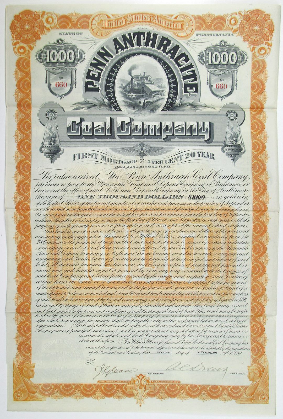 Pennsylvania, 1889. $1000 I/U 5% First Mortgage Sinking Fund Gold Coupon Bond, Black text with orange border and undertint, Train passing by mining building at top center. VF condition, HLBN.