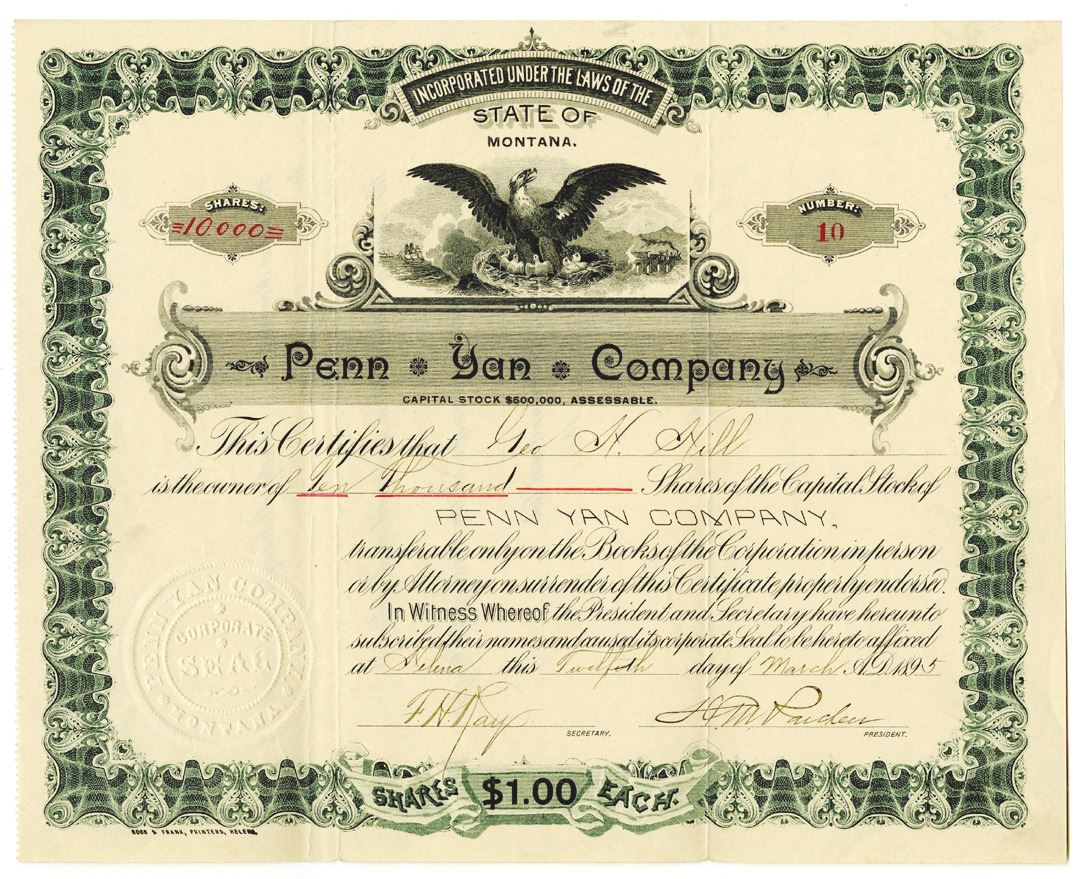 Montana, 1895. 10,000 Shares I/U Capital Stock Certificate #10, Black text with green border, Eagle with chicks at top center. Fine condition.