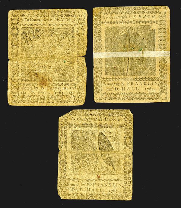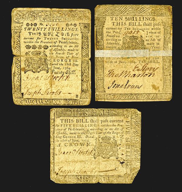 5, 10, 20 Shillings. SCWPM S2506, S2507, S2508. Nice evenly matched group. Plates C, B. A. The second with a non-contemporary repair. Printed by B. Franklin and D. Hall. Good. 3 pieces. (The Harry L. Rinker Collection)