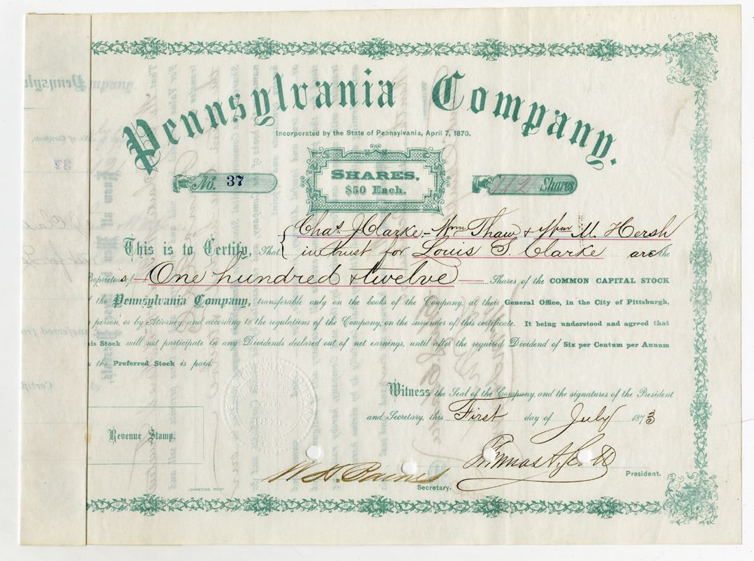 Pennsylvania. 112 Shares Common Capital Stock Issued and Cancelled Certificate, Green print on floral border, Company title at top, POC's along bottom, VF-XF condition. The Pennsylvania Company, later known publicly as the Pennsylvania Lines (west of Pittsburgh) was a major holding company. It included the Pittsburgh, Fort Wayne and Chicago Railway, the PRR's main route to Chicago. Thomas Alexander Scott (1823 Ð 1881) was an American businessman, railroad executive, and industrialist. President Abraham Lincoln in 1861 appointed him the U.S. Assistant Secretary of War, and during the American Civil War railroads under his leadership played a major role in the war effort. He became the fourth president of the Pennsylvania Railroad (1874-1880), which became the largest publicly traded corporation in the world and received much criticism for his conduct in the Great Railway Strike of 1877 and as a "robber baron." Scott helped negotiate the Republican Party's Compromise of 1877 with the Democratic Party; it settled the disputed presidential election of 1876 in favor of Rutherford B. Hayes in exchange for the federal government pulling out its military forces from the South and ending the Reconstruction era. In his final years, Scott made large donations to the University of Pennsylvania.