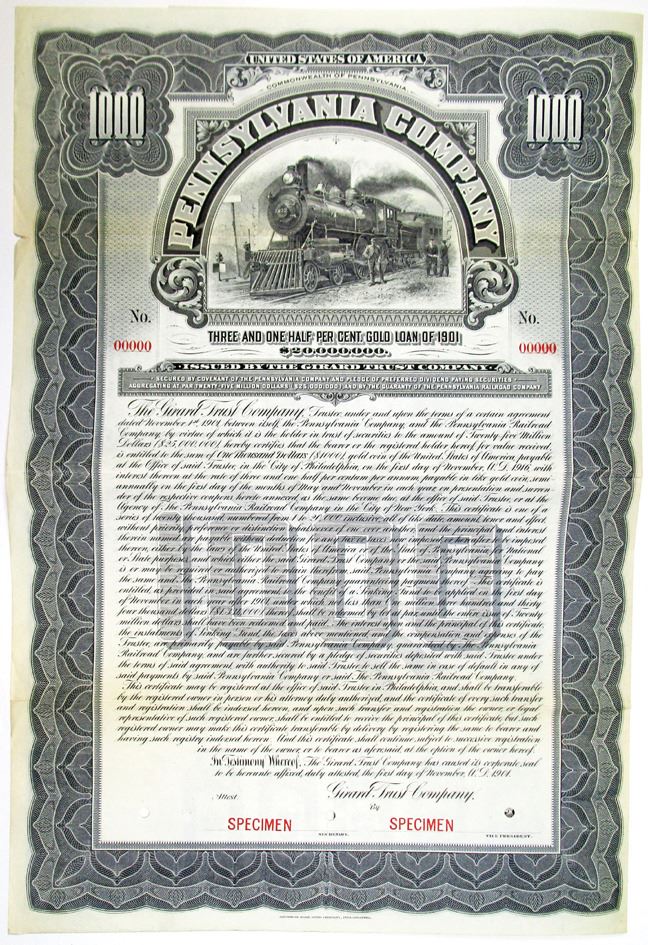 Pennsylvania 1901. $1000 Specimen 3.5% Gold Coupon Bond, Black text with gray border and underprint, Train passing by standing men at top center. Red specimen overprints, 00000 serial numbers, and POCs. Fine condition with slight splitting along folds, ABNC. Only listed as a specimen in Cox, Rare.