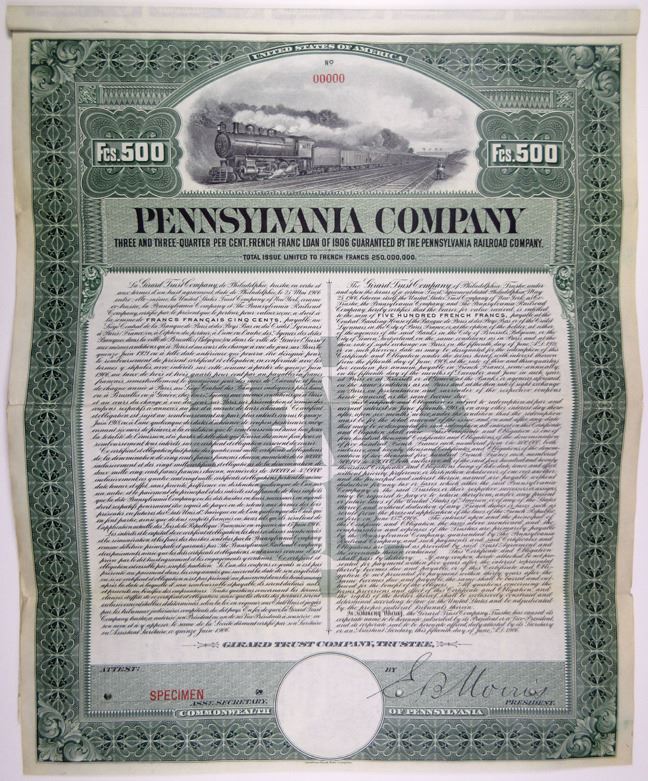 Pennsylvania. France. 500 French Francs Specimen 3 3/4% Guaranteed Coupon Bond, Black text with green border and underprint, Illustration of a Pennsylvania Company train passing by on tracks at top. Red specimen overprints, "00000" serial numbers, and POC's, VF with some minor staining on the back of the bond, ABNC. Only listed as a specimen in Cox, Rare.