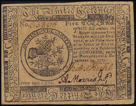 Pennsylvania. 2nd Issue, November 29th, 1775, $5. XF - AU condition with firm crisp paper and clear large margins. 2 small pin holes are in the body of the note near left border. Very attractive and highgrade note.