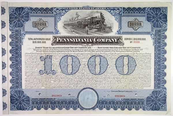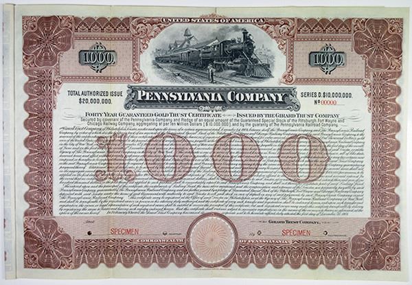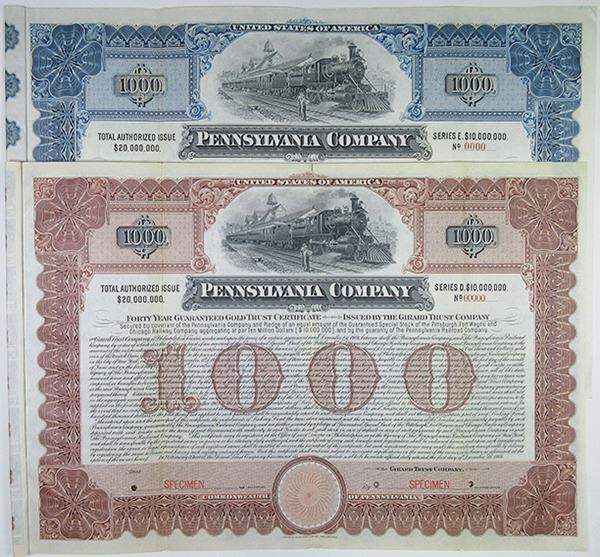 Pennsylvania. Lot of 2 Pennsylvania Company Specimen Bonds: Includes a 1904, $1000 Series D 3 1/2% Guaranteed Gold Trust Certificate Coupon Bond with black text and brown-red border and underprint. The other is a 1912, $1000 Series E 4% Guaranteed Gold Trust Certificate Coupon Bond with black text and blue border and underprint. Both have the same illustration of men standing beside passing train on tracks, with red specimen overprints, "0000" serial numbers and POC's, in VF condition and printed by ABNC. (2)