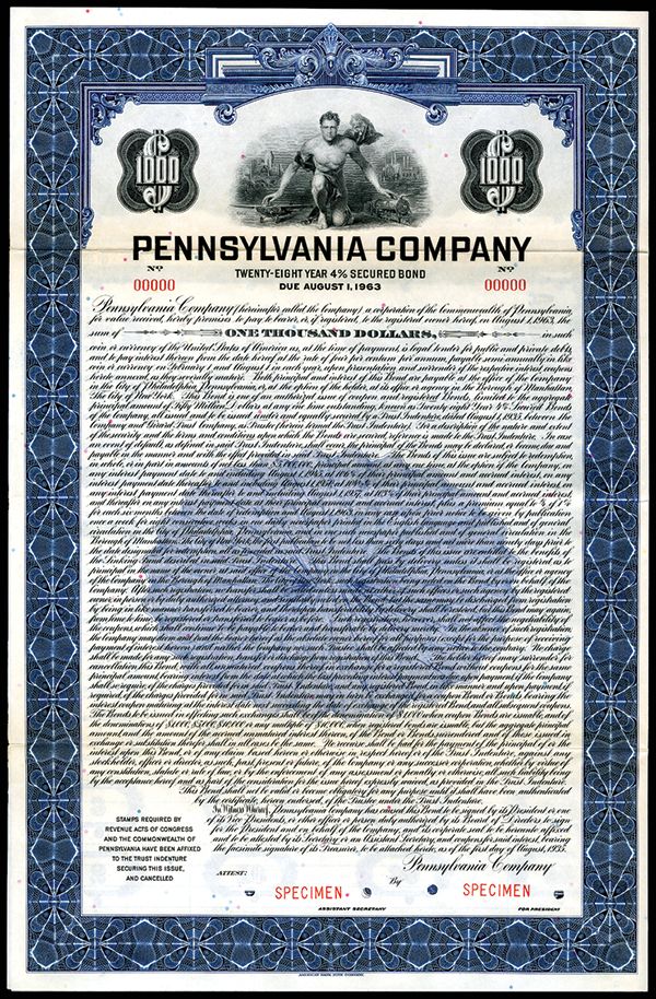 Pennsylvania Company, 1935, 28 Year 4 % Secured Coupon Bond. PA. $1000, Specimen Bond, Black on blue border and underprint, Allegorical nude man holding onto 2 trains at top, VF condition. Unlisted Railroad in Cox. *The Pennsylvania Company was a major holding company, owning and operating much of the Lines West territory (west of Pittsburgh and Erie, Pennsylvania) of the Pennsylvania Railroad, including the Pittsburgh, Fort Wayne and Chicago Railway, the PRR's main route to Chicago. It also owned but did not operate the Pittsburgh, Cincinnati, Chicago and St. Louis Railroad (Pan Handle Route), another line to Chicago. (*Wikipedia)