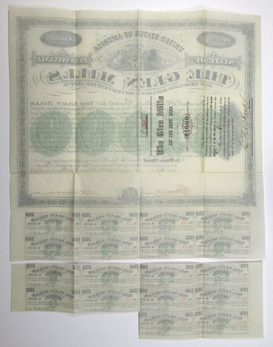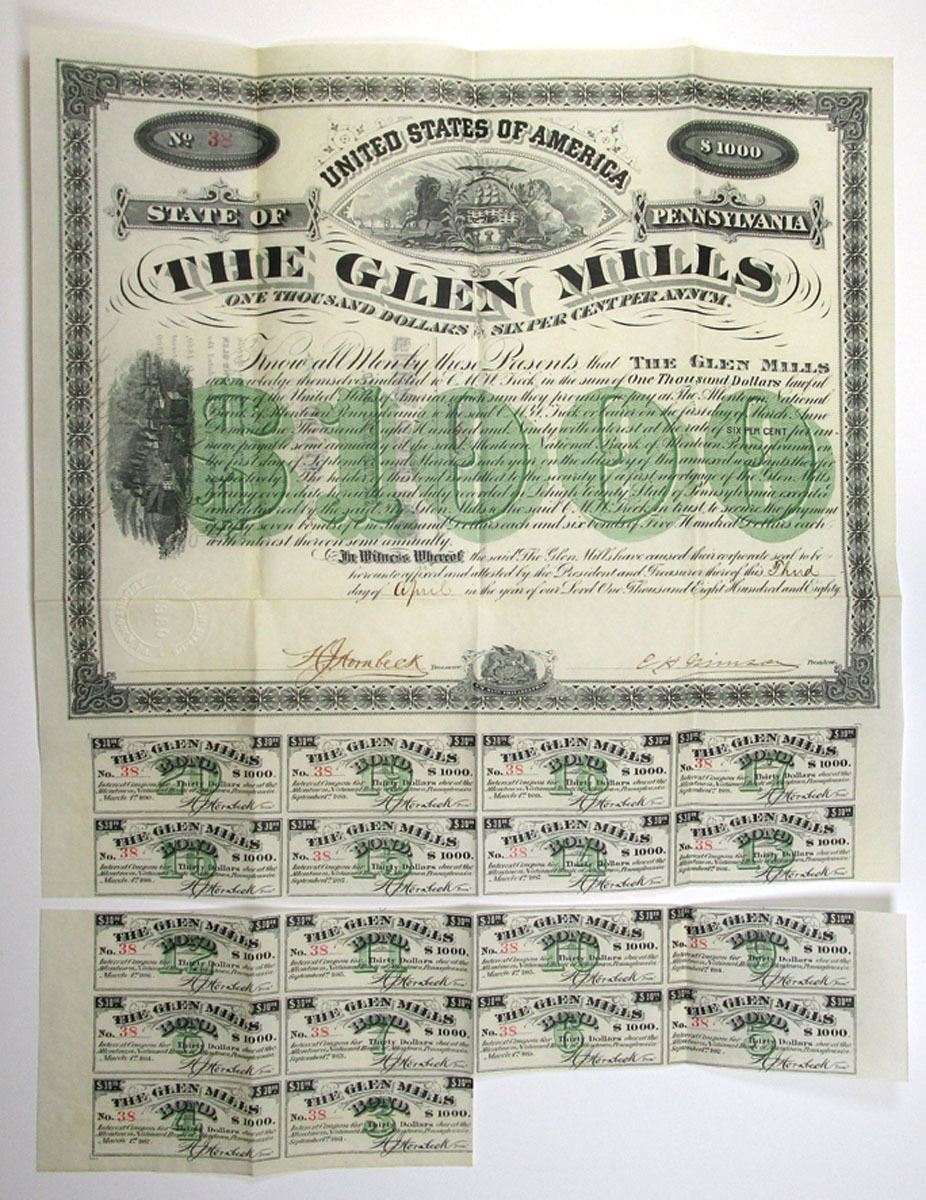 Pennsylvania, 1880. $1000 I/U 6% Coupon Bond, Black with green underprint, Arms of Pennsylvania at top with factory running up left side, S/N 38, VF to XF condition.