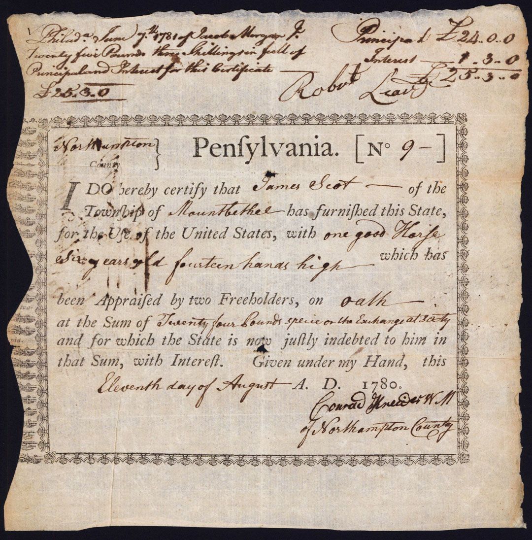Northampton County, Pennsylvania. 1780, Indentured receipt with ornate frame. Issued for "One good HorseÉ" furnished to the state for the use of the United States. Certificate #9. Two small internal fold split holes, otherwise Very Fine and rare.