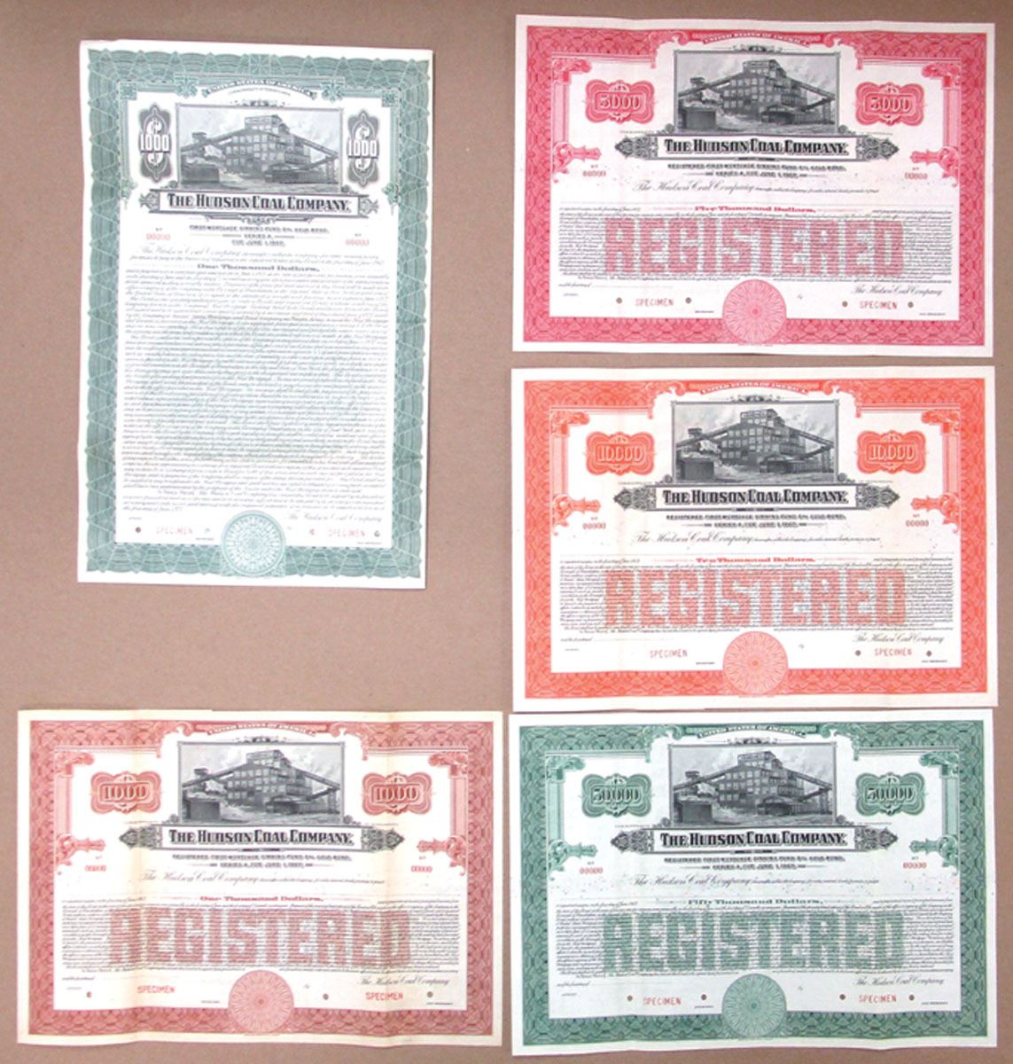 Pennsylvania, 1927. Lot of 5 Specimen Bonds, Includes: $1000 Coupon Bond; $1000, $5000, $10,000 , and $50,000 Registered Bonds in varying colors. All have Specimen overprints, POCs, are in VF to AU condition, and printed by ABNC. (5). The Hudson Coal Company, linked to the Delaware and Hudson Railroad, was a key anthracite coal producer in Pennsylvania, driving economic growth and supporting mining communities. Its decline mirrored the reduced reliance on coal in the mid-20th century. Sold "AS IS" no returns accepted.