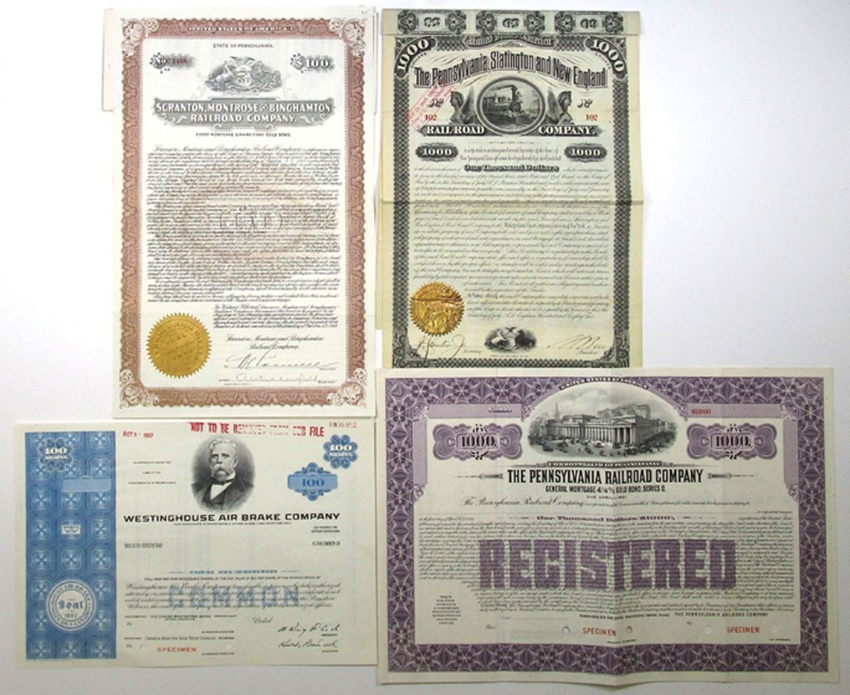 Pennsylvania & New Jersey, 1882 to 1967. Lot of 2 Specimen and 2 I/U Certificates, Includes 1882, Pennsylvania, Slatington and New England Railroad Co. $1000 I/U Coupon Bond; 1919, Scranton, Montrose and Binghamton Railroad Co. $100 I/U Coupon Bond; 1931, Pennsylvania Railroad Co. $1000 Registered Specimen Gold Bond; and, 1967, Westinghouse Air Brake Co. 100 Shares Common Stock Specimen Certificate. Specimens have overprints and POCs, and all range from VF to UNC condition. (4). Sold "AS IS" no returns accepted.