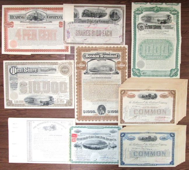 Various States. Lot of 35+ Stock and Bond Certificates, Highlights include: Pittsburgh & Connellsville Rail Road Co. Bond; West Shore Railroad Co. Bond; Wagner Palace Car Co. Stock Certificate; Reading Co. Jersey Central Collateral Bond; and Pittsburgh and Lake Erie Railroad Co. Stock Certificate issued to F.W. Vanderbilt. Frederick William Vanderbilt (February 2, 1856 Ð June 29, 1938) was a member of the American Vanderbilt family. He was a director of the New York Central Railroad for 61 years, and also a director of the Pittsburgh and Lake Erie Railroad and of the Chicago and North Western Railroad. Lot also has 31 Wagner Palace Car Co. I/C Stock Certificates, half for 10 Shares Common Stock and the other for 100 Shares Common Stock. All certificates range from Fine to VF condition. (38). Sold "AS IS" no returns accepted.