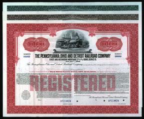 Michigan and Ohio. Lot of 3 bonds. 1927. All are 1st and Refunding Mortgage 3 3/4% Bonds, Series D. $1,000 (green), $5,000 (brown) and $10,000 (red), All have train at station with cab and man with suitcase. ABNCo. Specimens, XF. Rare bond trio.