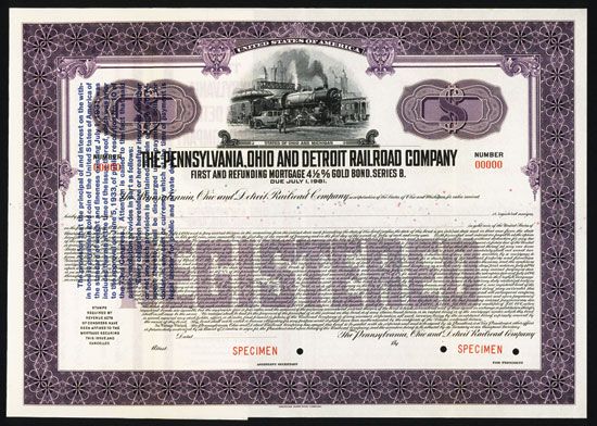 Michigan and Ohio. 19xx (ca.1933). 1st and Refunding Mortgage 4 1/2% Gold Bond, Series B. Purple border. Train at station with cab and man with suitcase. ABNCo. Specimen, XF. Rare legend added to bond to inform the buyer that the Gold clause has been changed due to the U.S. coming off of the Gold Standard in 1933 and the bond is payable in legal tender only, not gold. This clause has been found on a handful of certificates.
