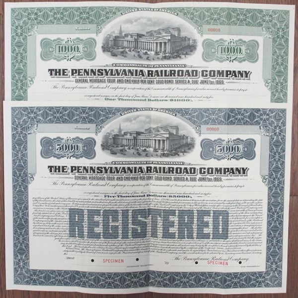 Pennsylvania. Lot of 2 Specimen 4.5% Registered General Mortgage Gold Bonds, Includes $1000 in green and $5000 in blue; Both with Penn Central terminal building, red specimen overprints, 00000 serial numbers, POCs, VF condition. ABNC. Both unlisted as a specimen in Cox. (2)