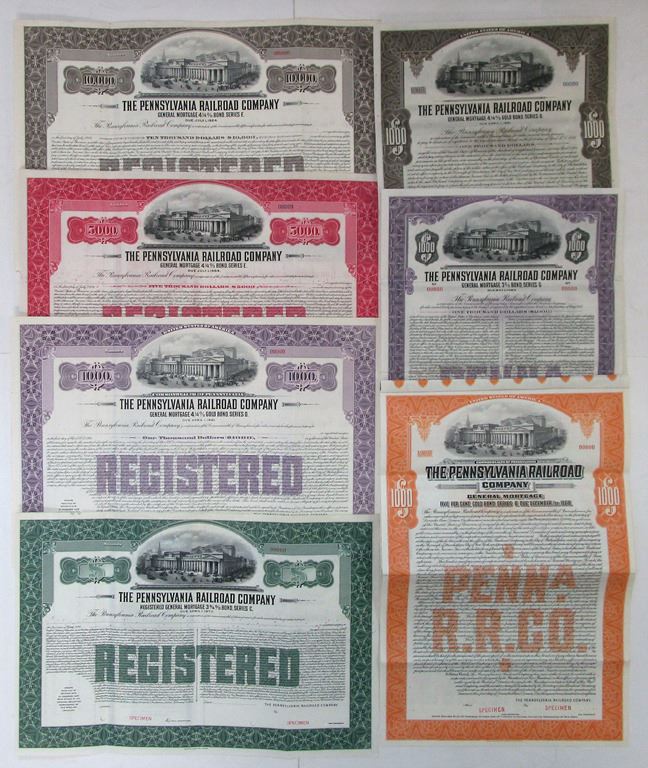Pennsylvania, 1918-45. Lot of 7 Specimen Bonds, Includes: 1918, $1000 5% Series B Gold Coupon Bond with an Orange border and underprint; 1945, $1000 3% General Mortgage Series G Coupon Bond with a Purple border and underprint; 1931, $1000, 4 1/4% General Mortgage Series D Gold Coupon Bond with a Brown border and underprint, Unlisted as a specimen in Cox, only known I/C; 1920, $-Odd Registered 3 3/4% General Mortgage Series C Bond with a Green border and underprint, Unknown denomination in Cox, first time seen; The following 3 bonds were previously only known as I/C, these are all specimens and first time seen: 1934, $1000 Registered 4 1/4% General Mortgage Series D Bond with a Purple border and underprint; 1934, $5000 Registered 4 1/4% General Mortgage Series E Bond with a Red border and underprint; and, 1934, $10,000 Registered 4 1/4% General Mortgage Series E Bond with a Brown border and underprint. All have Specimen overprints, POCs, and are in VF-XF condition. ABNC. (7). Sold "AS IS" no returns accepted.
